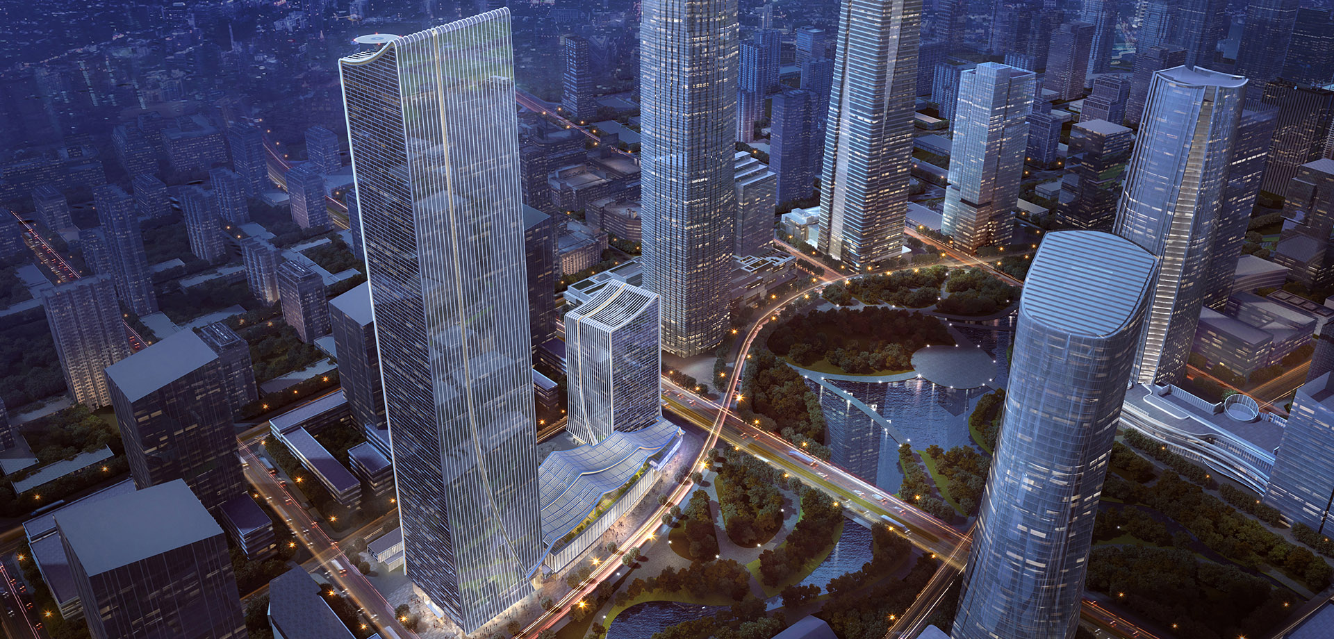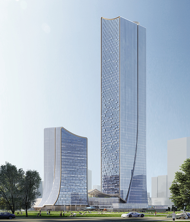 建筑高度:326.1m(65层) 幕墙面积:7.1万m² 项目设计:Aedas建筑设计事务所 幕墙类型:单元式玻璃幕墙等