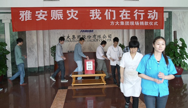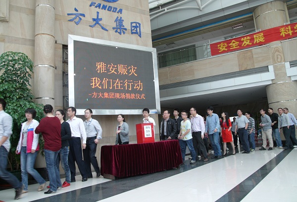 4月20日8时02分,四川省雅安市芦山县发生7.0级地震,人民生命财产遭受重大损失。一方有难,八方支援。在雅安人民在遭受灾难的时候,方大集团在第一时间号召集团全体员工为灾区捐款,支持雅安人民抗震救灾。集团总部和分布在北京、上海、成都、沈阳、南昌、东莞等全国各地的方大集团员工纷纷捐款,以实际行动献爱心。据不完全统计,截至4月23日,方大集团已经向雅安地震灾区捐款已达257462元,以帮助灾区人民重建家园,与灾区人民一起共渡危难。这也是继向汶川、玉树地震灾区捐款后,方大集团再一次向震区人民伸出援手,是方大集团“报国报民报一方”大爱精神的再次彰显。