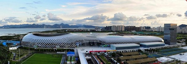 深圳湾体育中心“春茧”坐落于深圳市南山后海中心区,是第26届世界大学生夏季运动会分会场之一和开幕式场地,总建筑面积约32.2万平方米,其体育场、体育馆、游泳馆被置于一个白色巨型网格状钢结构屋面下,线条柔美的大屋顶犹如孕育破茧而出冲向世界的运动健儿的孵化器,表现出新的活力。