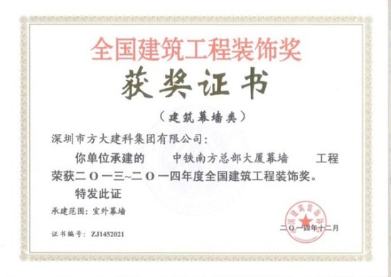 “2013-2014年度全国建筑工程装饰奖”获奖结果在北京揭晓,深圳市方大建科集团有限公司荣获四项建筑幕墙类大奖,获奖项目分别为:中铁南方总部大厦幕墙工程、大连万达公馆1#楼幕墙工程、嘉里建设广场二期幕墙工程、中广核大厦幕墙工程。
