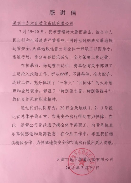 近日,天津地铁运营公司向方大自动化系统有限公司发来感谢信,高度评价自动化公司在天津地铁“抗暴雨、保运营”行动中的优良表现。感谢信说,