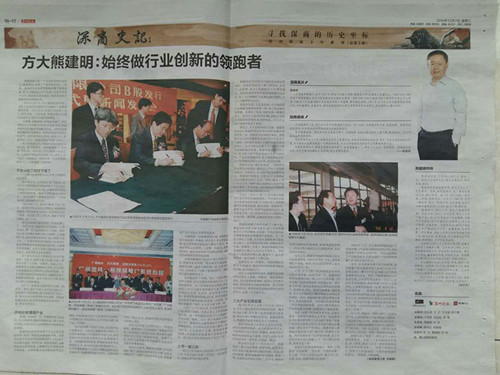 2016年12月7日,《深圳晚报》深商史记栏目以两个整版超大篇幅报道开云在线平台董事长熊建明的风雨创业历程,讲述了熊建明董事长20多年来在建筑新材料、节能环保等行业领域的奋斗故事,记录了他把方大集团从3万元起家、市场为零的小公司,培育成领先国内同行、坐拥多项技术成就奖的领袖级企业的传奇经历,淋漓尽致地展现了熊建明董事长“敢为天下先”的奋斗姿态和朴实的创业情怀。