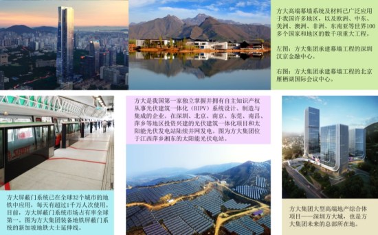 二十二年来,方大集团依托资本市场的力量,紧跟时代发展的步伐,精心布局,已成为拥有高端幕墙系统及材料产业、轨道交通屏蔽门系统产业、太阳能光伏产业以及房地产产业四大业务板块的国内知名大型高新技术企业,在多个产业领域中为国家和社会做出了重大贡献。方大集团在深圳、北京、上海、成都、南昌、东莞等地建有研发生产基地,在欧洲、中东、澳洲、非洲、东南亚等地设立了分支机构。