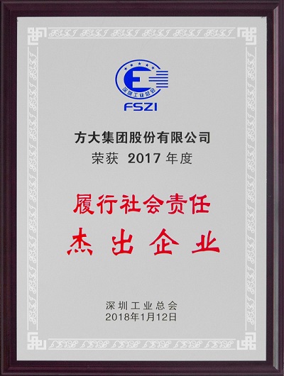 2017年度“履行社会责任杰出企业”荣誉称号由深圳工业总会评选,授予积极履行社会责任、有极强的社会责任荣誉感的企业,本届共有包括方大集团在内的19家企业获得了该项荣誉称号。