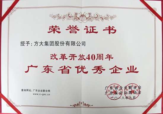 9月26日,由广东省企业联合会、广东省企业家协会主办的第24届广东省企业家活动日大会在广州举行,活动对“改革开放40周年广东省优秀企业、优秀企业家”进行了表彰,方大集团因在改革开放以来作出的突出贡献被授予“改革开放40周年广东省优秀企业”称号。省委书记李希接见了方大集团等优秀企业、优秀企业家代表,省长马兴瑞出席会议并讲话。