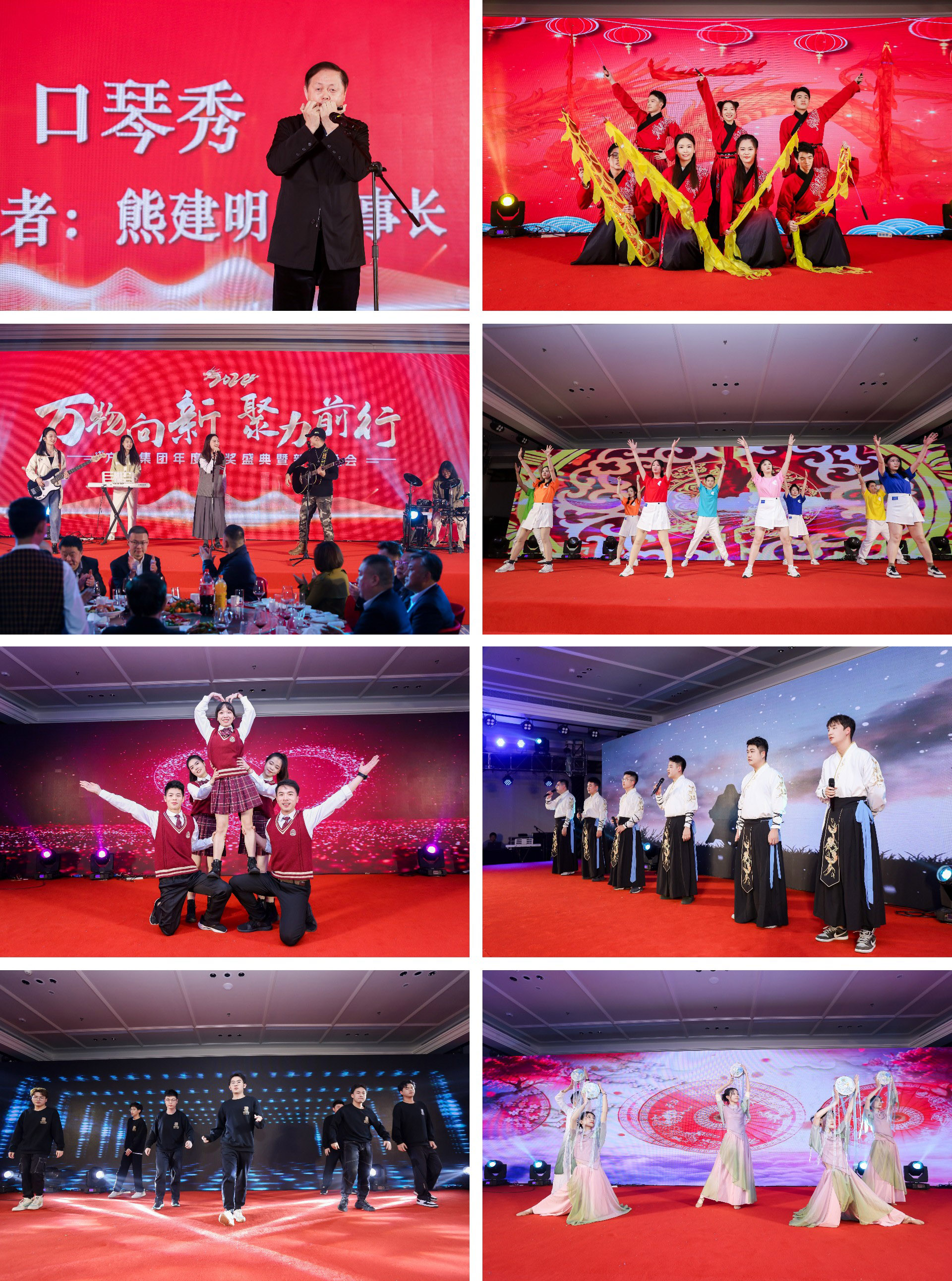 随后各公司准备的精彩节目轮番登台,多才多艺的方大人奉献了一场包含舞蹈、合唱及乐队表演的精彩晚会,充分展现了员工的活力和团队凝聚力,赢得现场掌声不断。董事长熊建明带来惊喜口琴秀,悠扬的琴声为每一位观众送上了最诚挚的祝福。
